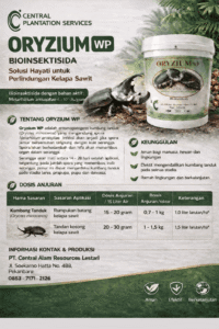 Oryzium WP Adalah entomopatogen kumbang tanduk (Oryctes rhinoceros) yang mengandung spora Metarhizium anisopliae. Infeksi akan terjadi jika spora jamur bersentuhan langsung dengan kulit serangga. Spora akan berkecambah dan hifa akan menembus organ dalam serangga. Serangga akan mati antara 14 – 28 hari setelah aplikasi, tergantung pada jumlah spora yang menembus kulit serangga, jamur ini dapat menginfeksi kumbang tanduk pada stadia larva, prapupa, pupa dan dewasa